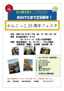 松山観光港ターミナルビルは、平成12年の開業以来、おかげ様で本年10月7日をもちまして25周年を迎えることとなります。ご利用の皆様方に、深く感謝申し上げます。
